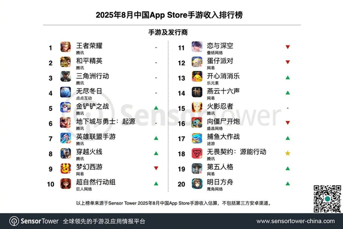 简介【#8月苹果手游收入排名#】 Sensor Tower公布8月中国Apple store手游收入排行,《王者荣耀》《和平精英》《三角洲行动》包揽前三,《超自然行动组》首次跻身前十,8月19日发布的新游 ...